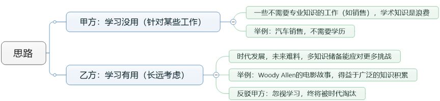 题目是两种对立观点(浪费时间VS有用),聚焦在学习这一件事情上,我们可以在论证时分几种具体情况讨论这两种结果,